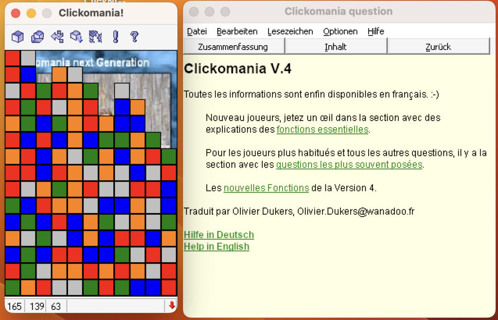 Clickomania passt auch ins Bild der Sharewareszene jener Zeit auf dem Mac, wie man sie auch bei der „SWISS MAC FREE / SHAREWARE LIST“ von Ralph Schwegler findet. Hier gibt es die klassischen Games mit Fullscreen und Anspruch auf die ganze Aufmerksamkeit und eben die anderen ’neueren‘ Spielausführungskonzepte. Viele dieser Spiele folgen nicht mehr dem Paradigma des Arcade/Console/Computerspiel-Fullscreens fürs Game, sondern sind eher „Nebenher-Casual“ Games wie BrightChick und co. Ihre Spielzeit scheint designed zu sein für 5 maximal 15 Minuten Spielzeit. Oft werden deswegen die Levels per Zufall generiert und sind nicht mehr in einem Levelsystem untergeordnet.