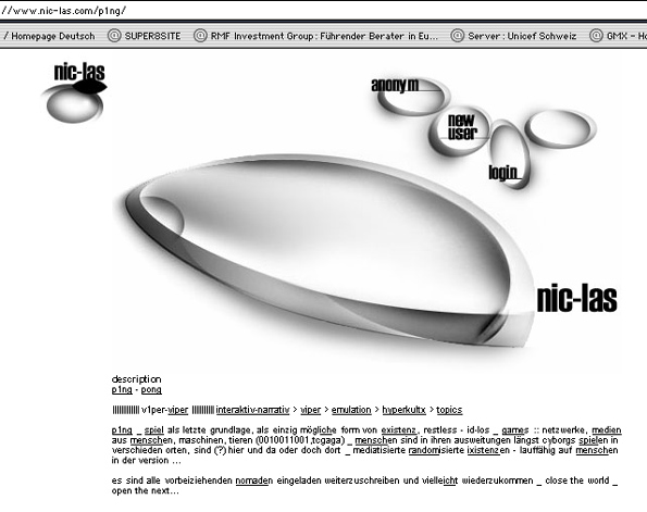 Den gleichen Designstil verwendete imp89 auch für das “konkreative autopoietische Schreibtool” Nic-las (1997-2003) (fig.5), das er nun unter seinem richtigen Namen René Bauer zusammen mit Joachim Maier entwickelte (Bauer, Maier 1997). Nic-las war ein kollaboratives Schreibsystem, das frei im Netz allen zur Verfügung stand und mit innovativen Funktionen ausgestattet war. Das Tool war auf dem Prinzip der Differenz aufgebaut. Bauer und Maier bezeichneten die einzelnen Zettel des Zettelkastens von Nic-las, nach Niklas Luhmann, als ‚Differenzen‘. Diese Zettel konnten nicht nur Text, sondern auch Links, Bilder, Töne, Filme und Dokumente enthalten und wurden virtuell mehrfach eingeordnet. Die vielen Möglichkeiten erlaubten sogenanntes ‘Schwebendes Schreiben’. Mit diesem Tool, der als Vorläufer so mancher Social Media Plattform gelten kann, liess sich der Prozess des Scheibens aus seinem starren Korsett lösen und wurde allmählich zu einem kollaborativen Prozess, der nicht mehr den einzelnen Autor in den Vordergrund stellt, sondern das gemeinsam erarbeitete Wissen, das stetig weiter anwächst, detaillierter wird und neues Wissen zu generieren vermag (cf. Suter 2004).